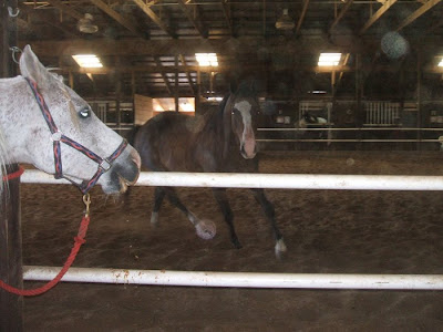 While Quzqo was enjoying his mash and being brushed, they had a couple of new horses loose in the indoor arena, who didn't WANT to be caught. They were tearing around the arena, bucking and snorting and blowing, galloping and careening.